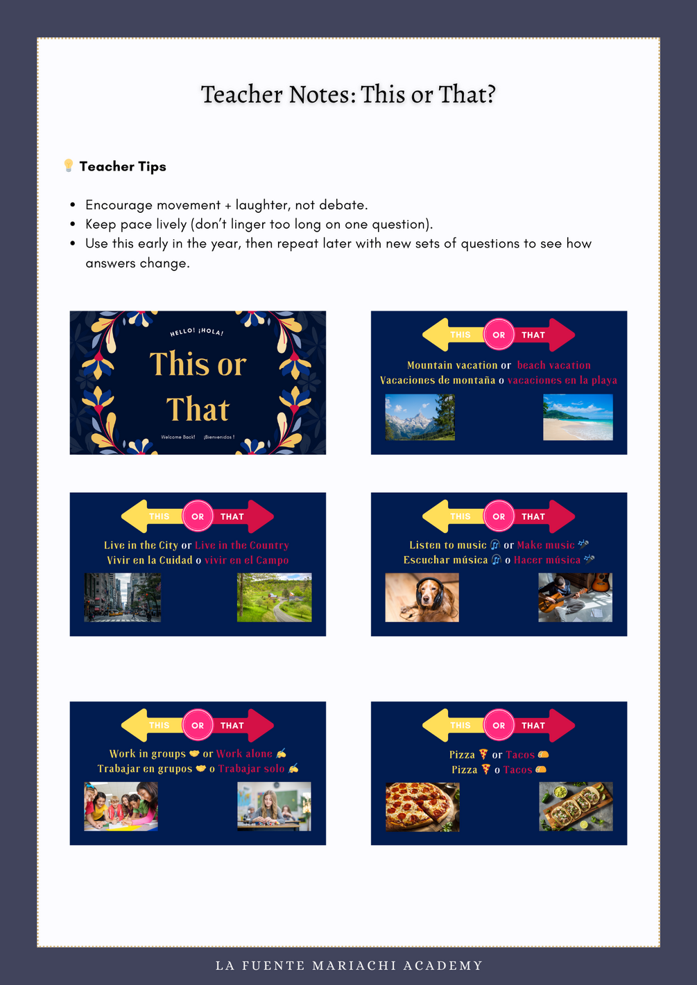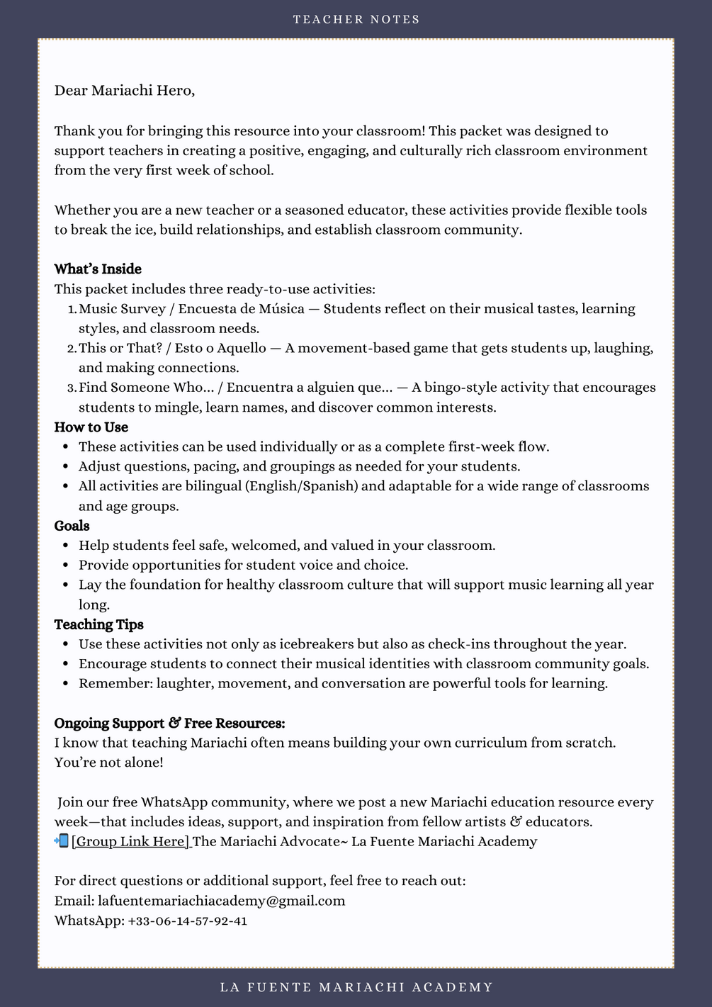 When you purchase this packet, you’ll receive a bilingual PDF with three ready-to-use classroom activities (Music Survey, This or That, and Find Someone Who Bingo), complete teacher guides with step-by-step instructions, and a suggested first-week flow to help you start the year with confidence, connection, and joy.
