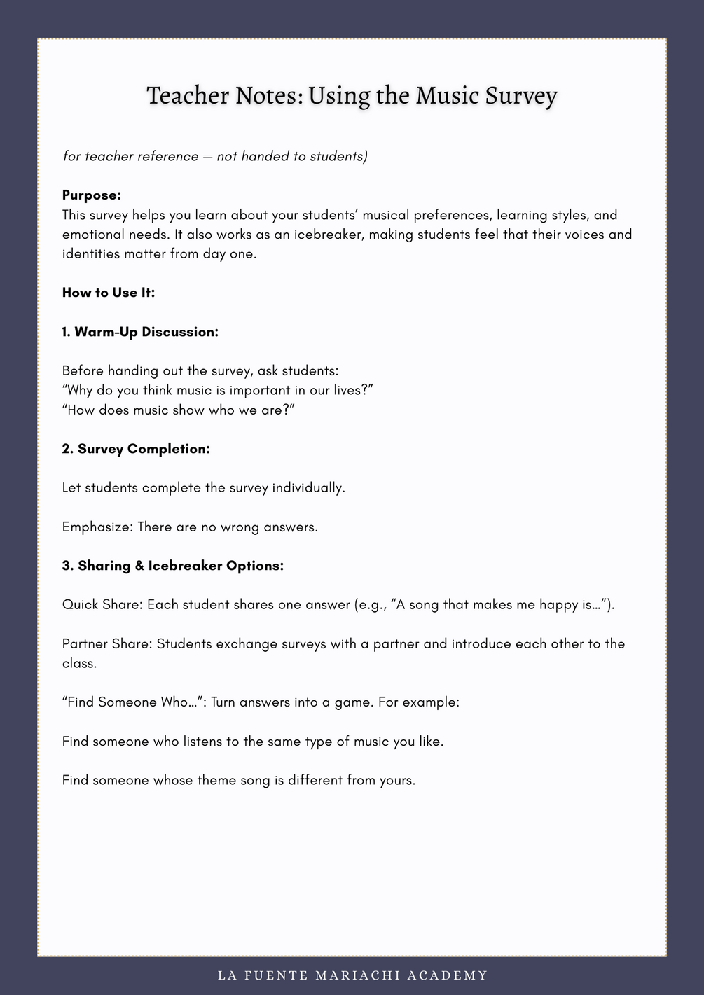 A bilingual questionnaire where students share musical tastes, learning styles, and classroom needs. Perfect for relationship-building and lesson planning. -