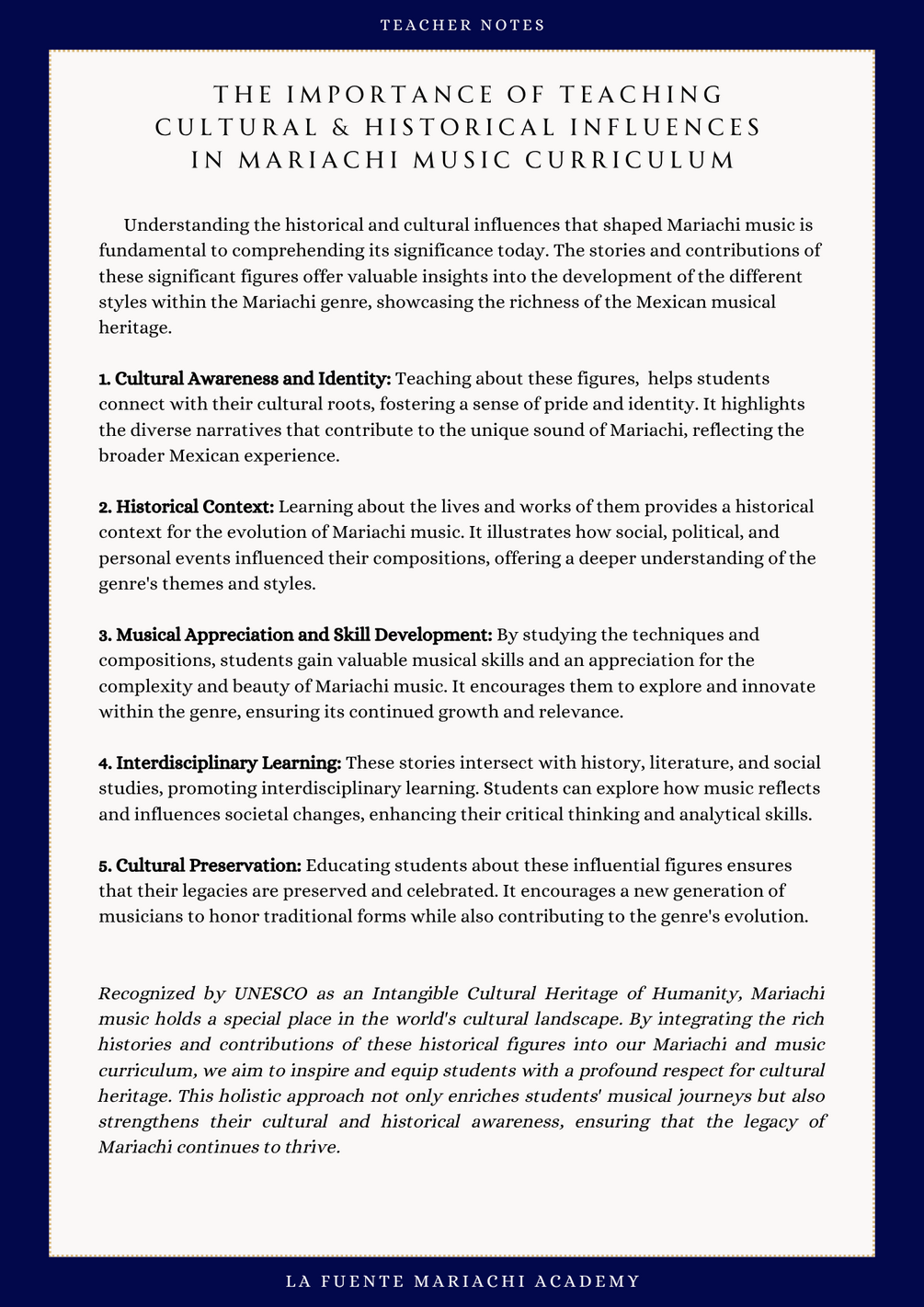 Deepens students' connection to Mariachi music and its history.