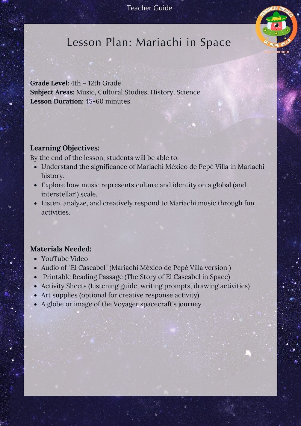 Designed for music teachers, cultural educators, and homeschoolers, this lesson pack will excite and inspire students while deepening their appreciation for Mariachi music, space exploration, and global heritage.